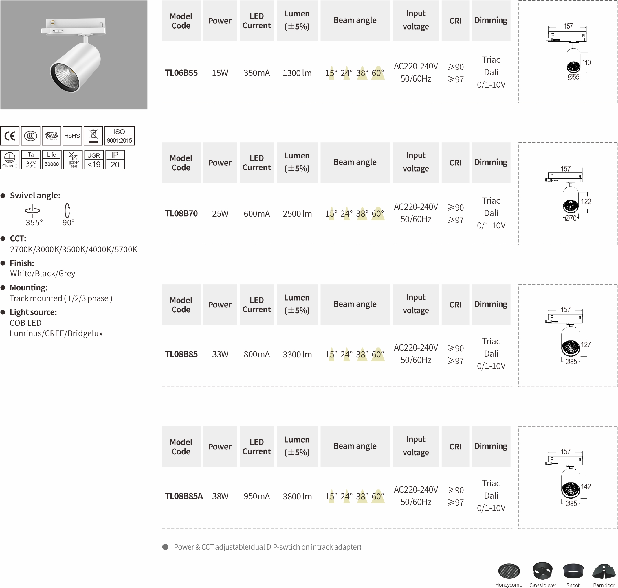 Hedy Series Is With Integrated Driver Adapter To Make The Fitting With Longer Lifespan It Adopts Aluminium Reflector With Even Lighting Distribution Die-cast Aluminum Heat Sink Provides Great Heat Dissipation 3 Different Sizes D90/d100/d110mm With Optical Accessory Choices Of Cross Luver Honeycomb ,wall Washer , Barn Door Ect.