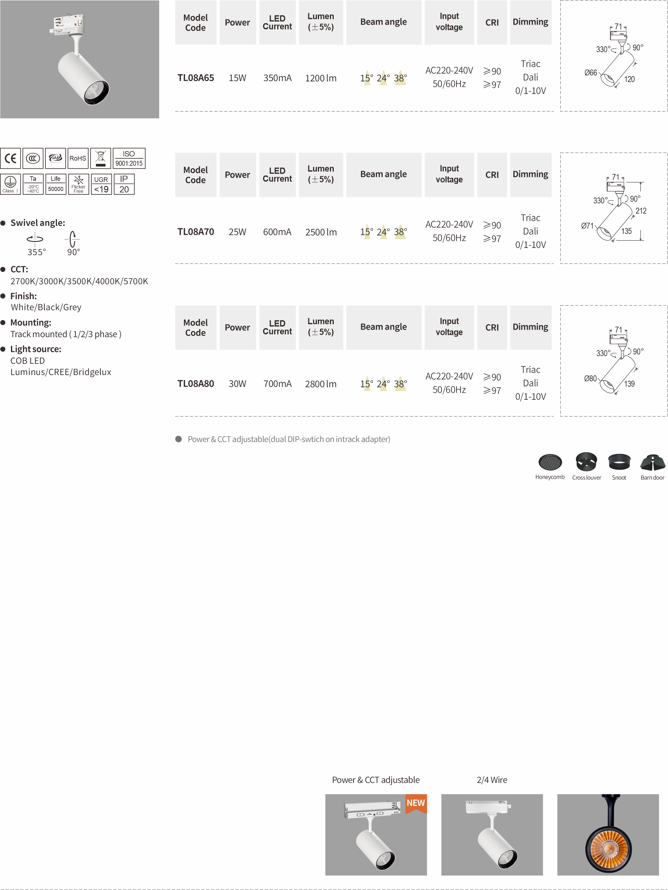 Leila Series Is With Built-in Driver And Adopts Brand Cob Chip.Die-cast Aluminum Heat Sink Provides Great Heat Dissipation.3 Different Sizes With Optical Accessory Choices Of Cross Luver Honeycomb ,wall Washer , Barn Door Ect.