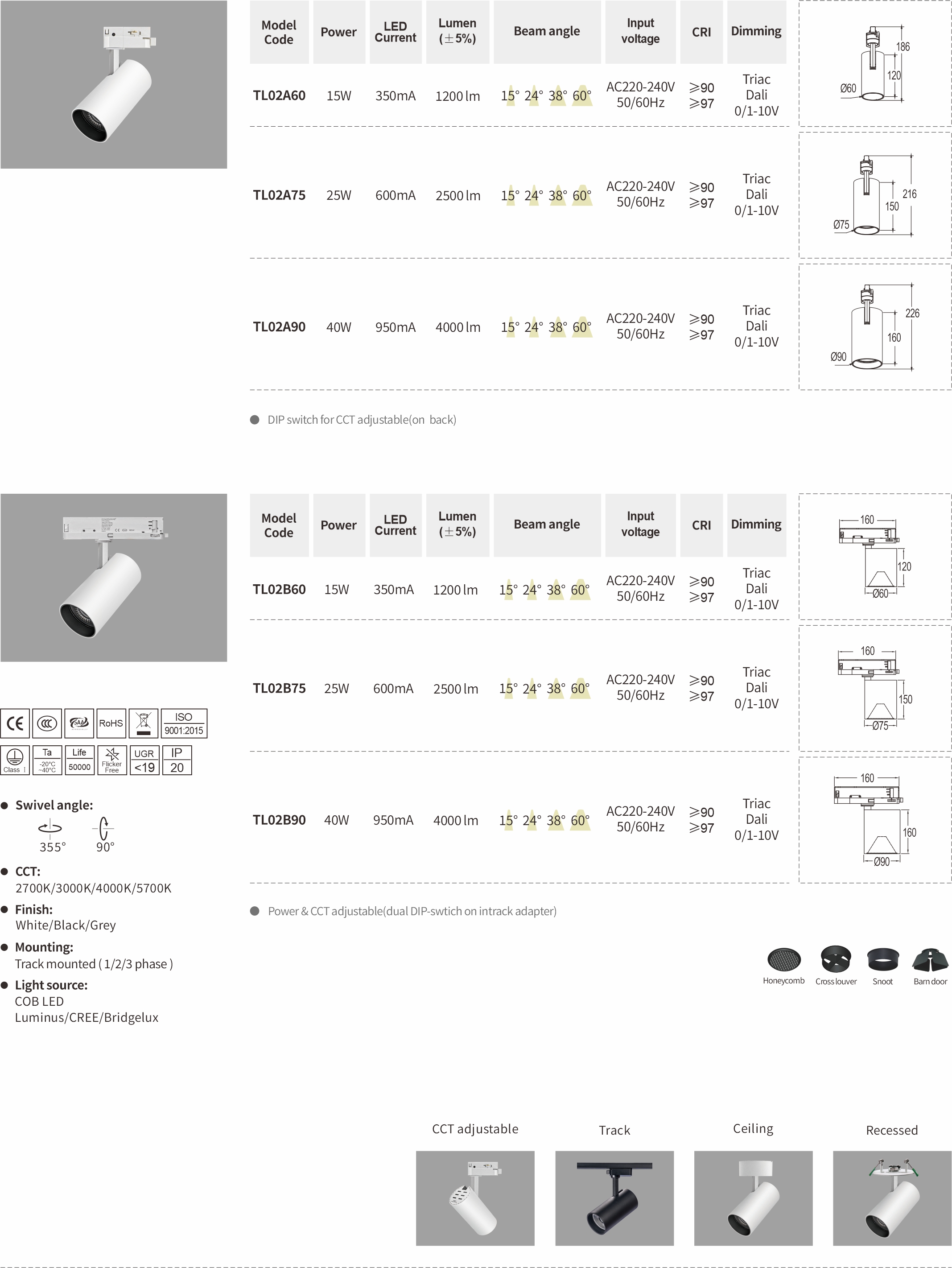 Milo series is with built-in driver and adopts brand cob chip Die-cast aluminum heat sink provides great heat dissipation 3 different sizes d60/d75/d90mm with optical accessory choices of cross luver honeycomb ,wall washer , barn door ect